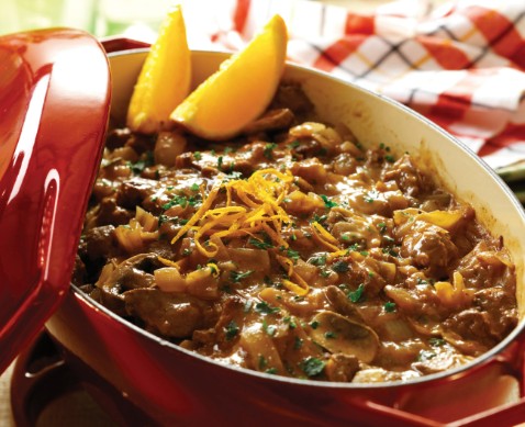 Mix flour and oxtail soup together. Roll meat in flour mixture. Heat a little oil in large frying pan and brown meat in batches. Place in 8-cup capacity casserole dish or slow cooker. Toss onions (cut into quarters) in remaining flour. Add remaining oil to pan and toss onion in hot oil until lightly browned. Add to casserole. Place orange juice, beef stock, marmalade, orange rind and sherry in frying pan and bring to boil. Pour over meat and onion. Cover and bake for 2 hours or slow cook 6 hours. Garnish with orange rind and serve with carrot and kumara mash. | |